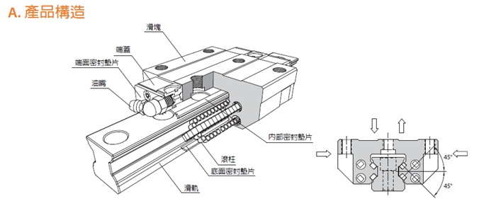 透过有限元素法FEM的结构应力分析,优化的四列式滚柱45°接触角与高刚性断面设计,除了提供径向、反径向及横方向四方向更高的负荷能力,并且可利用预压调整增加其刚性,更适合各种安装方式的应用。